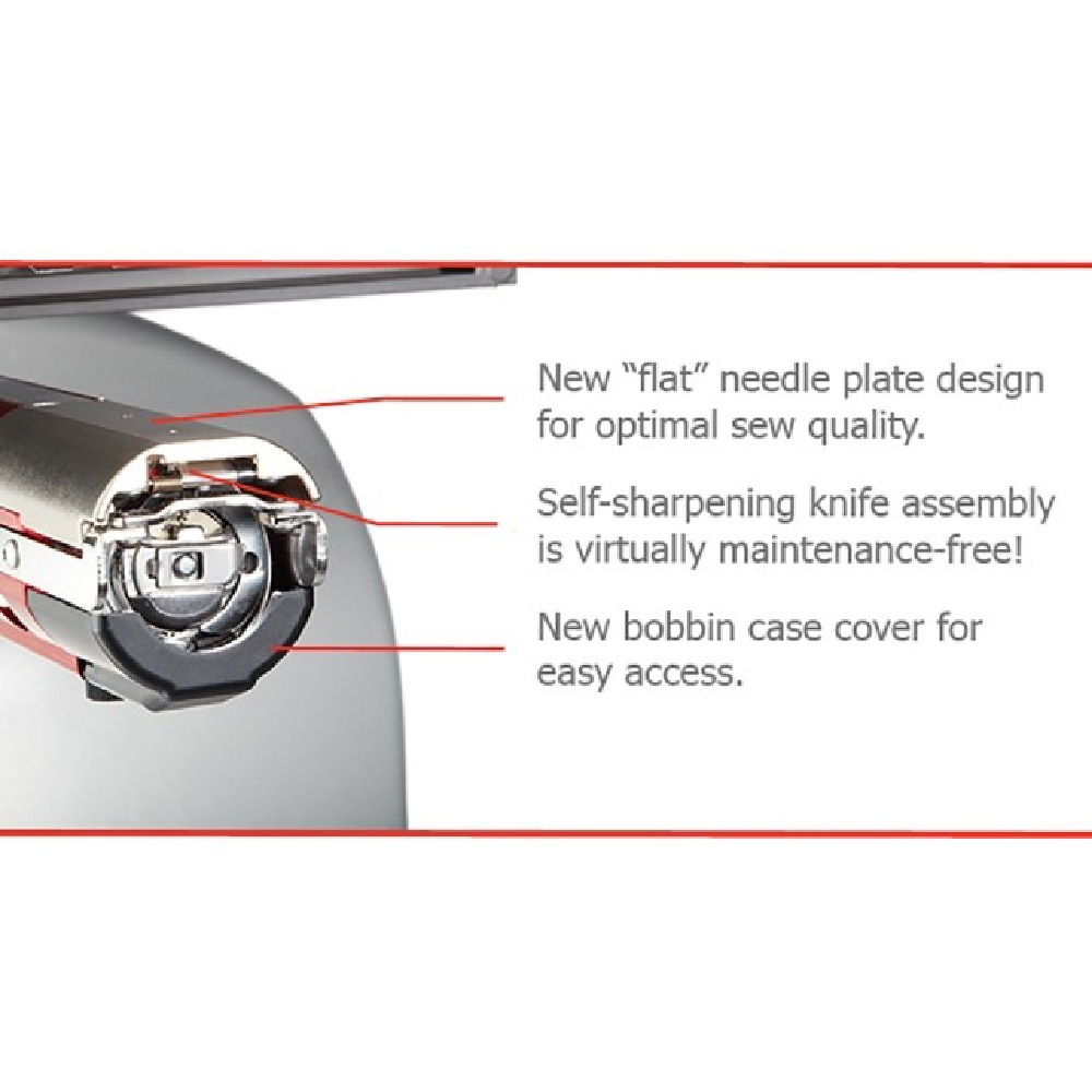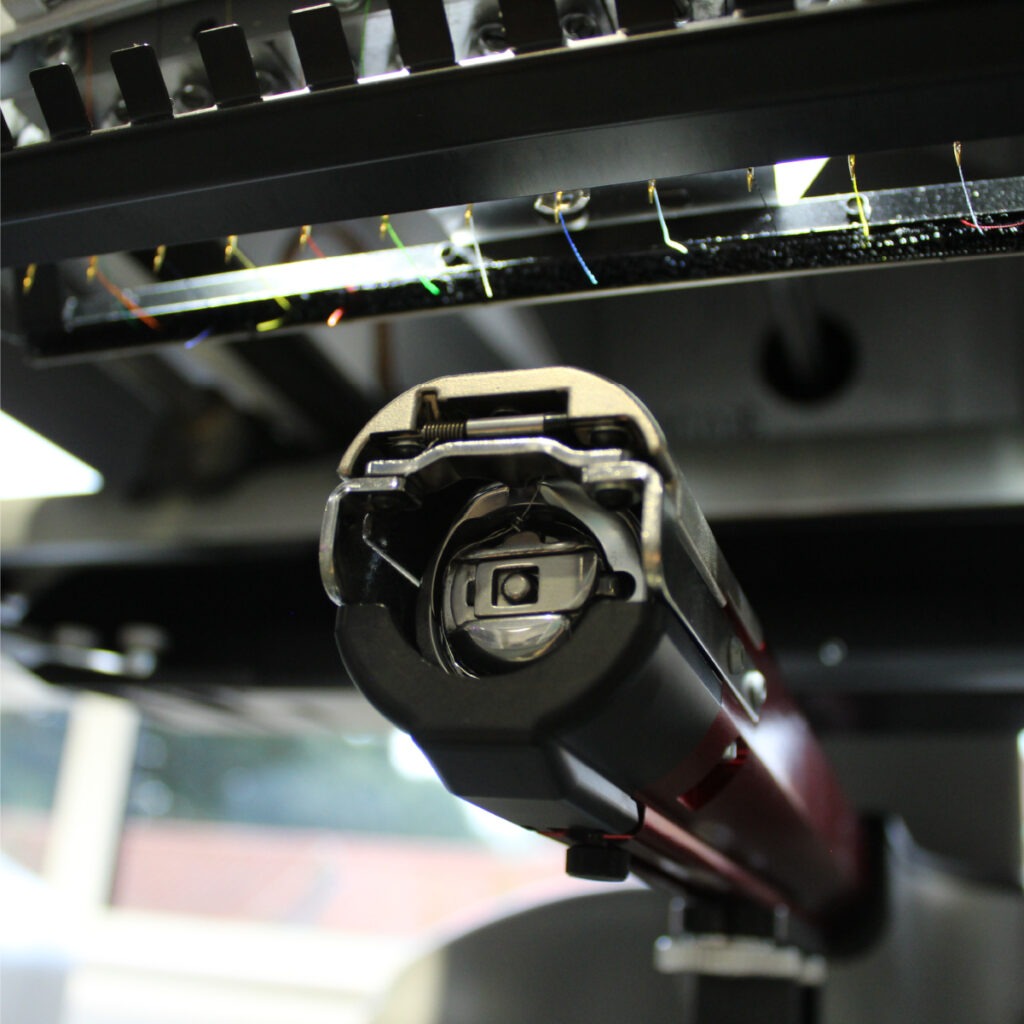 The new auto trimming system is durable and reliable. Overall trim time has been reduced dramatically, which in turn reduces overall sew time. The self-sharpening carbide knife assembly consistently slices poly, rayon, metallic, and thick Burmilana thread. It’s also virtually maintenance-free.