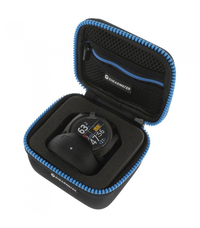 The Teric offers an information screen utilizing a {1.39 in | 35 mm} full color AMOLED display with a { Diameter x Height | 55mm x 18mm } body and { 4.25 oz | 120.4 g } weight. Brightness levels are user adjustable and accessible with just one button press. During a decompression dive, the Teric provides complete information displays of all required stop times. The Teric can provide time-to-surface based on “look ahead” at planned gas switches. Multiple gas definition presets are supported with any combination of oxygen, nitrogen and helium. The Teric will NOT “lockout” after a missed stop or ascent rate violation. After the dive, the Teric communicates via Bluetooth to connect with the Shearwater Cloud dive log manager, which is compatible with MS Windows, OS X, iOS and Android devices, supporting wireless log downloads and firmware updates.
